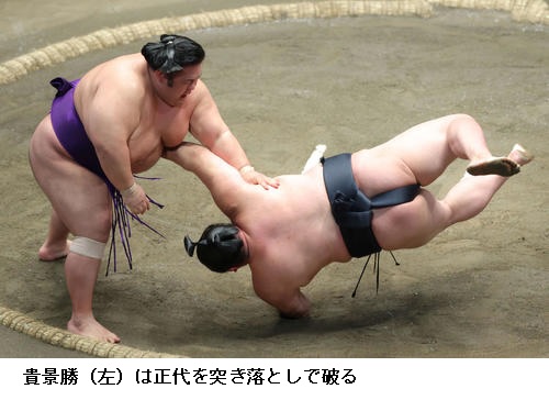 ▽大関・貴景勝に大関・正代は貴景勝が突き落としで勝ち越しました。