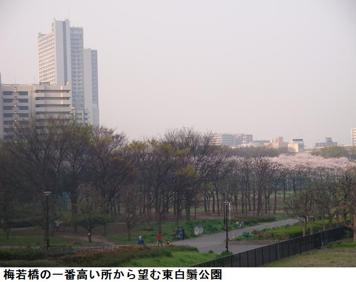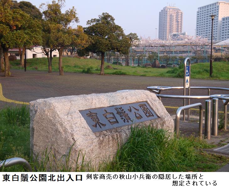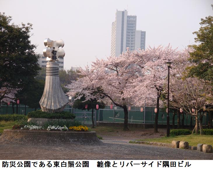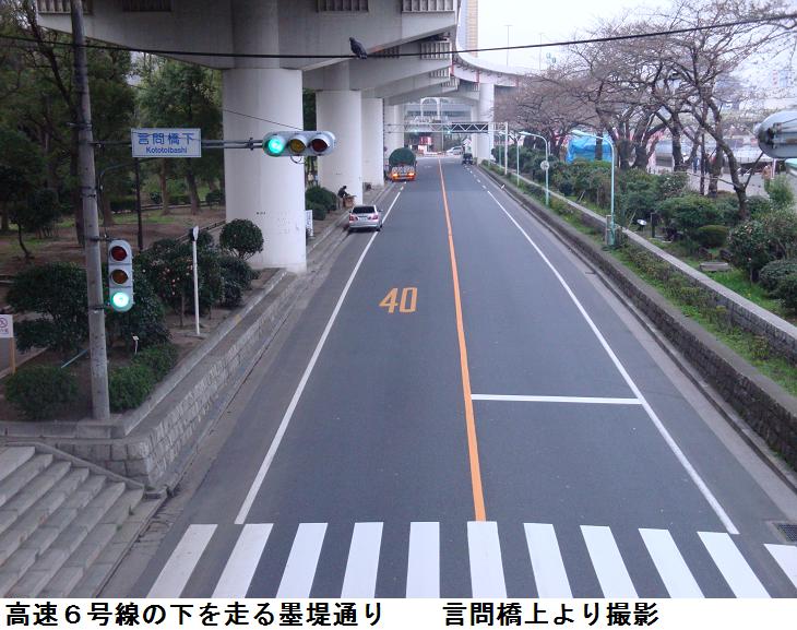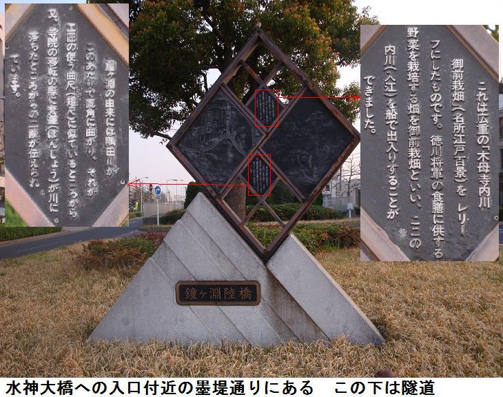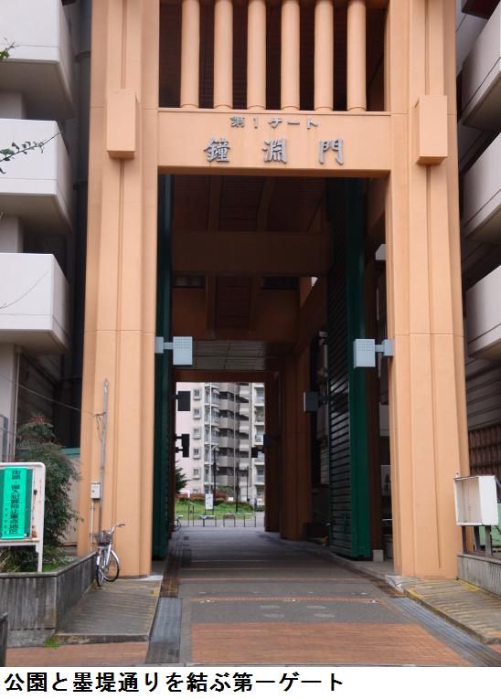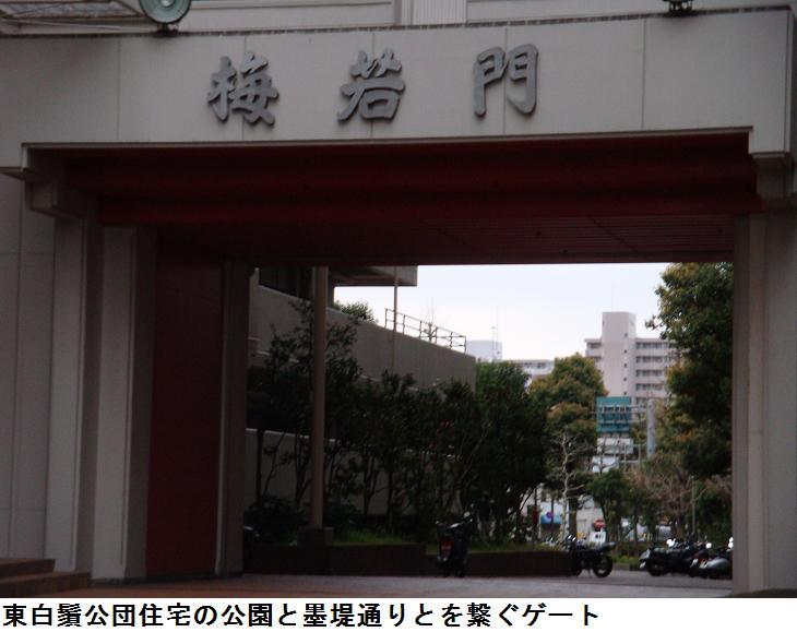 現在はここは鐘ヶ淵陸橋というらしく、この下は隧道なっていて、車輌の往来に利用されている。さらに進むと、東白鬚公園の北出入口がある。公園のすぐ北側は墨田区立鐘ヶ淵中学校で、池波正太郎は『剣客商売』の秋山小兵衛の隠居所をこの辺りに想定したという。