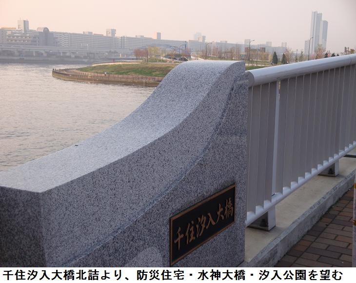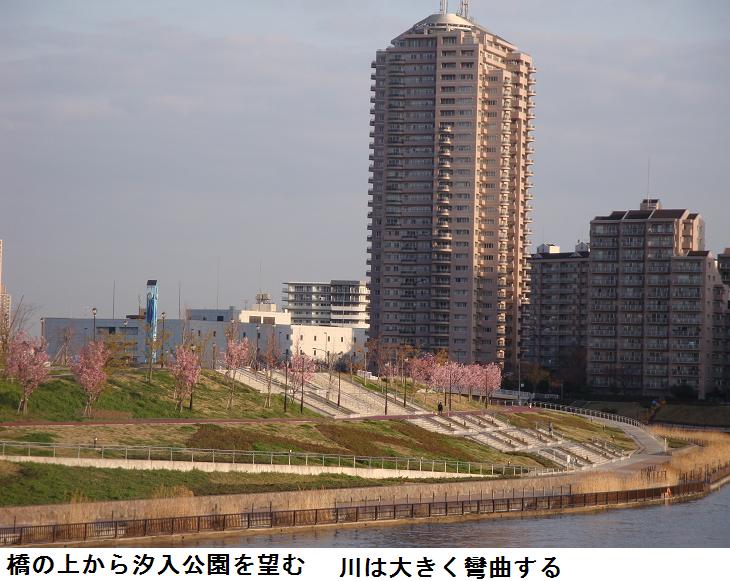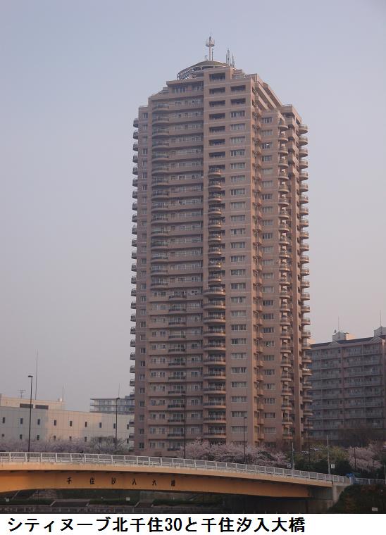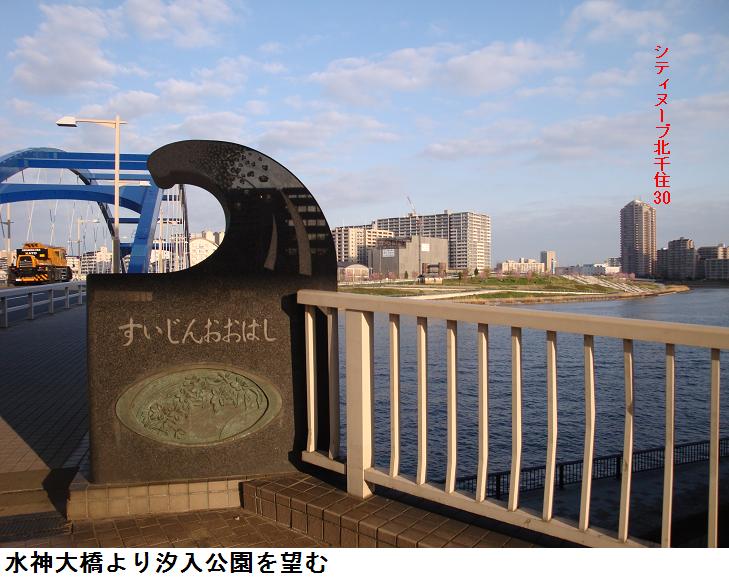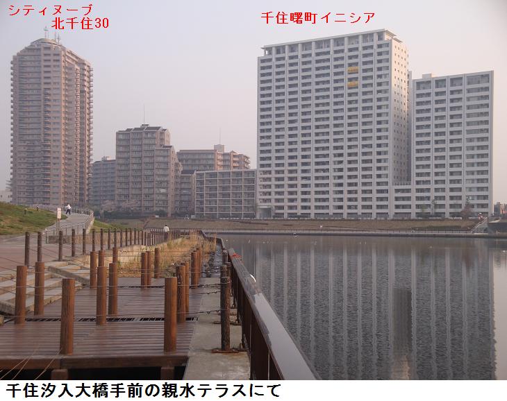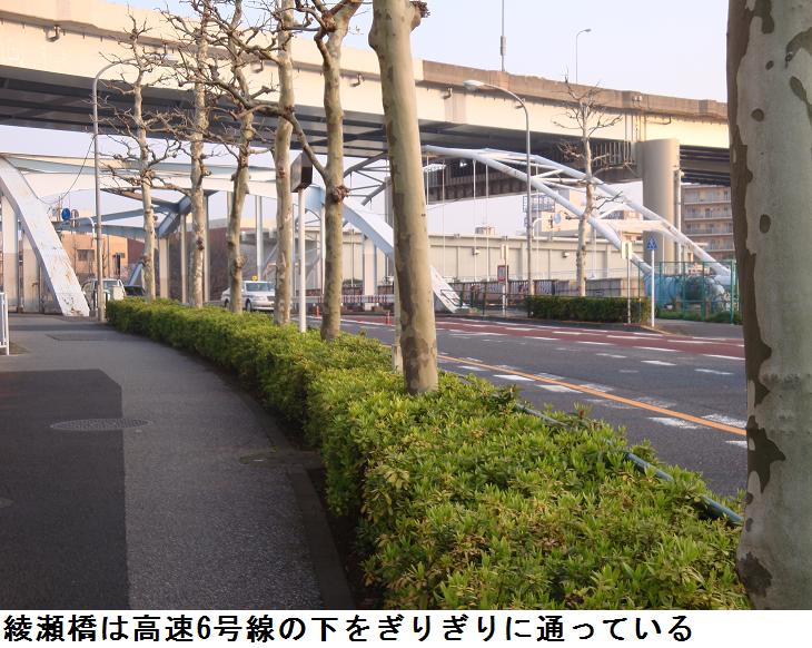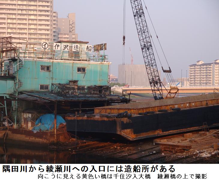 旧綾瀬川が隅田川と荒川を繋ぎ、ここに綾瀬橋が架かる。その上をぎりぎりに高速6号線が通る。旧綾瀬川の河口には荷役船の造船所がある。最近、此処と千住汐入大橋の間に『千住曙町イニシア』と名付けられたマンション群が建てられ、このほど完成したらしい。盛んに入居者を応募しているようだが、一体全体、不景気不景気といわれながら聞くのと見るのとでは大違いの感である。