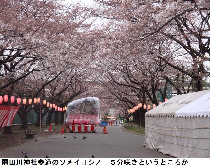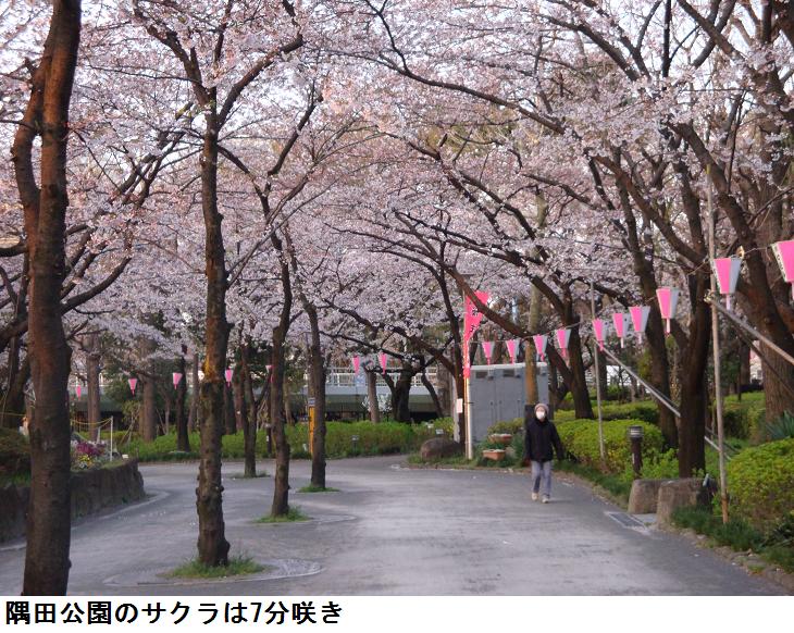 随分、夜明けがはやくなった。5時30分だともう明るくなる。我が家から隅田公園を南下、吾妻橋を渡って、墨堤の遊歩道に出る。桜は5分咲きというところか、場所によってはまだ3分咲きというところ。今朝はうららかな春の兆しであるから、桜も満開になり、明日・明後日の土・日は人出で賑わうことであろう。