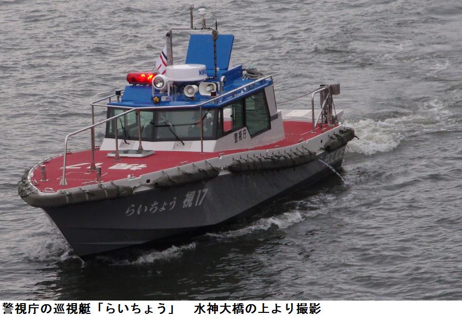 東白鬚公園の北の入口から公園に入り、梅若橋の下道を通ってけやき通りに出て、水神大橋の北側歩道を通っていると、警視庁の巡視艇「らいちょう」が、川を下ってくる。