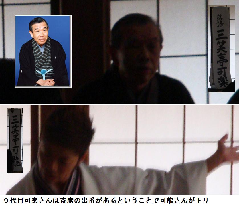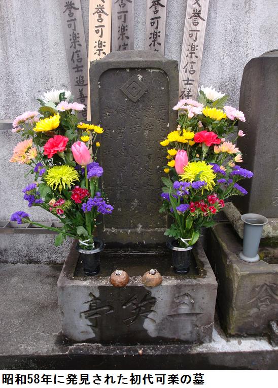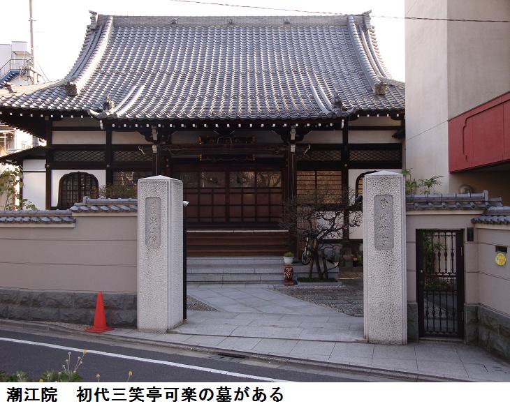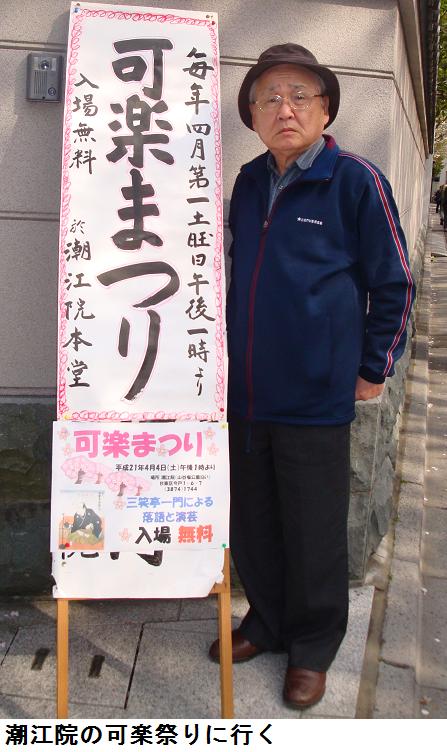 昼食後、午後1時から始るという潮江院に出かける。山谷堀公園の桜は満開で、随分の人出である。超行員にはほぼ満員の人々が本堂を埋めていた。一番後ろの席をとり、堰の上に立ち上がって写真を撮ったが、逆光なのでどうしても画像が暗くなってしまう。九代目可楽さんの写真は何とかインターネットから借用できたが他の面々の写真は見つけ出すことが出来なかった。まあ、落語はさすがにプロ級でこれが無料で聞けるのは見っけもんである。落語が終って、墓地に出て初代可楽のお墓にお詣りしてきた。