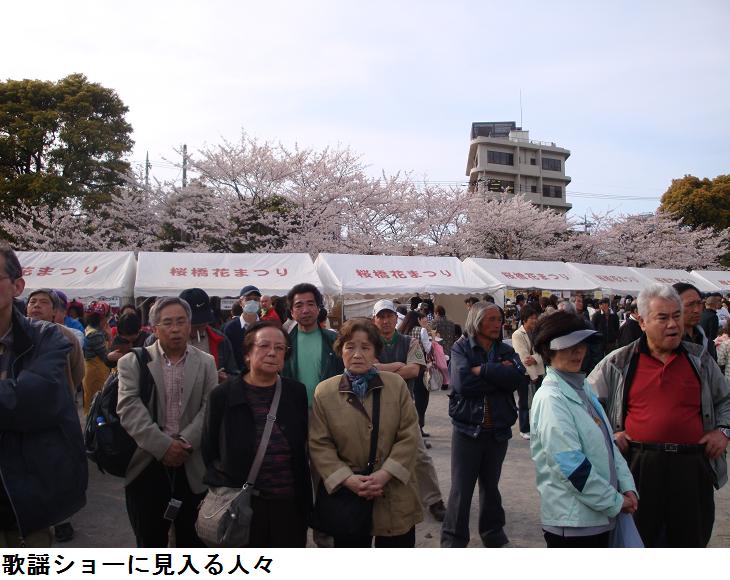 午後3時を過ぎて、山谷堀の水門前に行って見た。まあ、何処から集まってきたのか凄い人出である。広場に設えられた舞台では次か次へとこれから世に出ようかというあまり名の知られていない歌手か、すでに花を咲かせ年老いた歌手が入れ替わり立ち替わり声を張り上げていた。