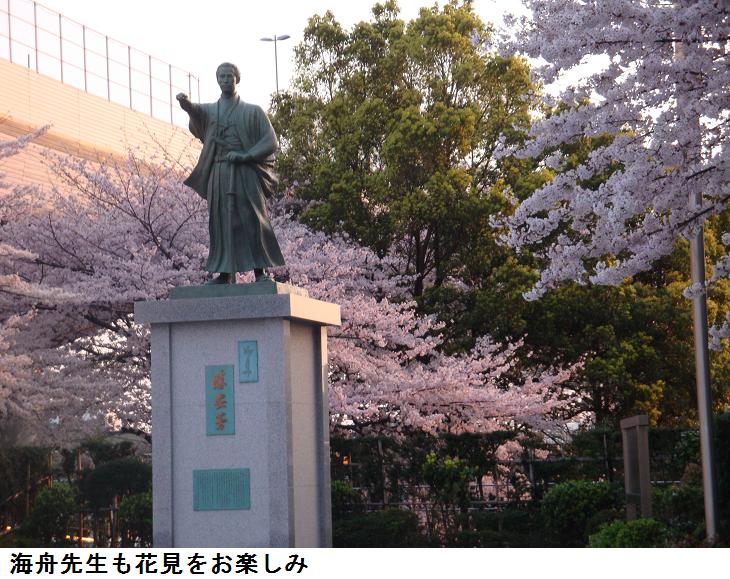 吾妻橋を渡って墨田区役所の裏手にいます海舟先生も朝日の光りの中で花見を満喫なさっていらっしゃる。浮世絵等にみられる江戸時代の墨堤とはすっかり変わってしまったのだろうが、現代の墨堤も当時以上に風情のあるものかもしれない。