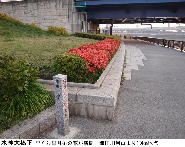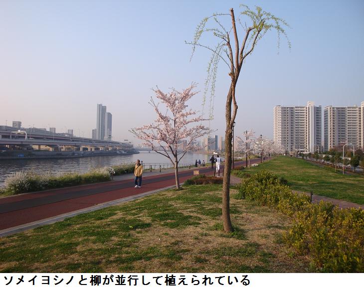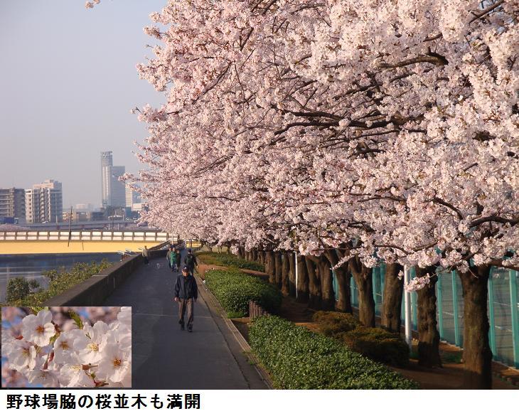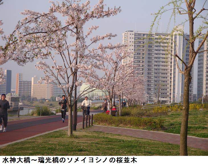 千住汐入大橋を渡り、汐入公園を南下する。ヨウコウザクラの並木はもう殆んど花が散って、葉桜になりかけているが、水神大橋を過ぎて瑞光橋までの間はソメイヨシノが若木ながら満開、これと並行して柳が植えられているが、桜も柳も成長して大木になれば「見渡せば柳桜をこきまぜて都ぞ春の錦なりける」(素性法師 844?~910?年)という光景が見られるかもしれない。
