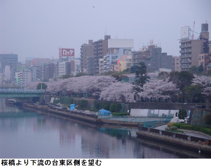 山谷堀水門前の桜まつり設備はすっかり取り払われていた。今朝は花曇り、朝靄を付いて桜橋の上から、隅田川の下流・上流の花景色を撮ってみた。花はもう散り始めている。良く見ると所々に赤茶っぽい葉芽が覗いている。もう1週間もすれば、葉桜になってしまうのだろう。
