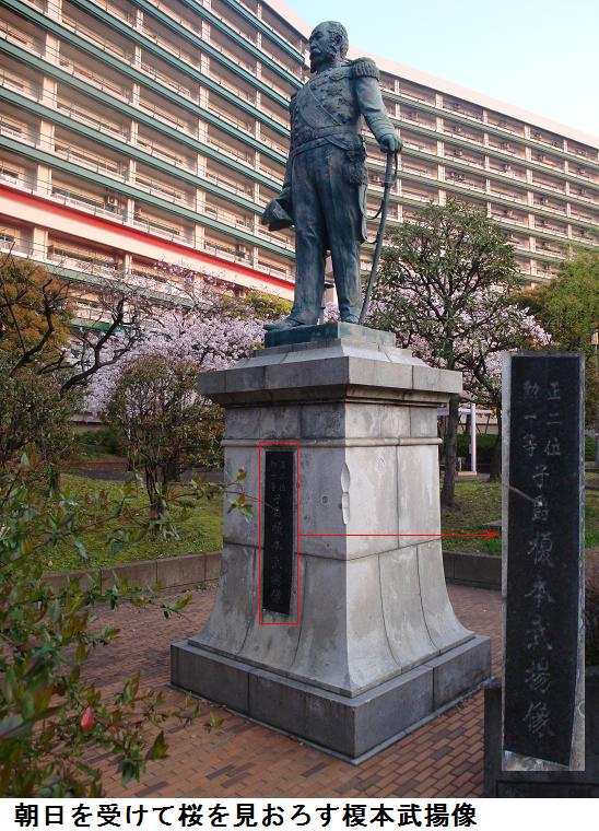 桜橋を渡ると、墨堤通りを北上。明治通りも横切って、防災住宅と並行する墨堤を進むと、朝日を浴びて桜をバックに榎本武揚先生の銅像が建っている。昨日勝海舟先生の銅像を撮ったので、幕臣にして同じように藩閥政府に貢献した榎本先生もと、カメラのシャッターを押していた。