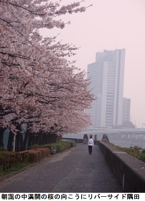 まだ、完全に明け切れていない遊歩道を通っているとチラリホラリと桜の花びらが舞いかかる。春靄に霞んだ隅田川では頭が黒くなりかけたユリカモメが遊んでいる。