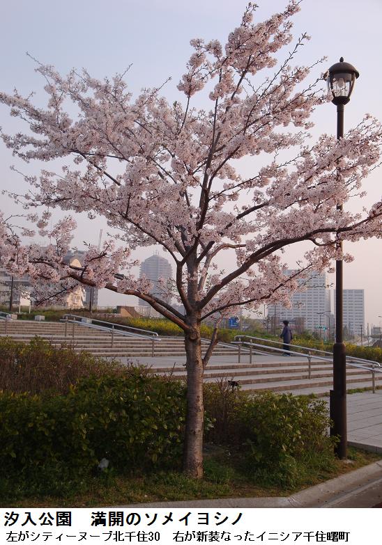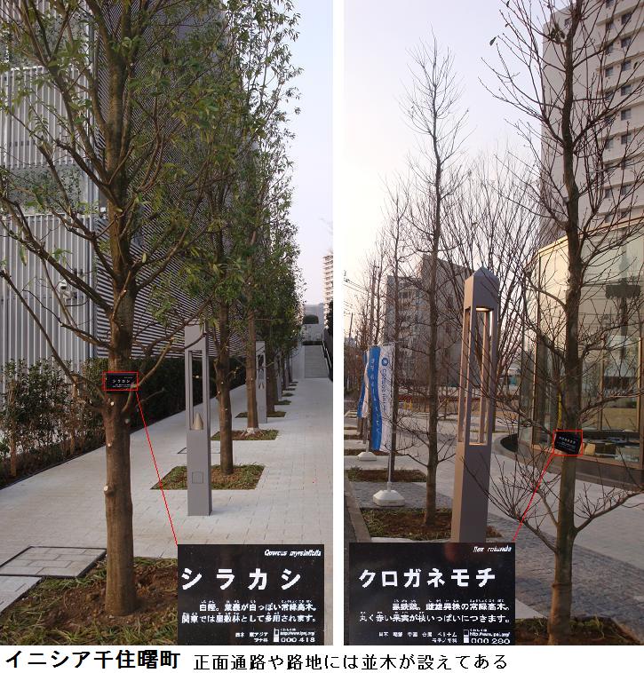 千住汐入大橋近くになると最近新装なったイニシア千住曙町のマンションが、従来のシティヌーブと並んでその威容を誇っているようである。千住汐入大橋を渡り、ビルの中道をとおって、イニシア千住曙町の前に出てみた。ビルの間道や正面には東南アジア系の珍しい木が並木に用いられ整然と植えられている。