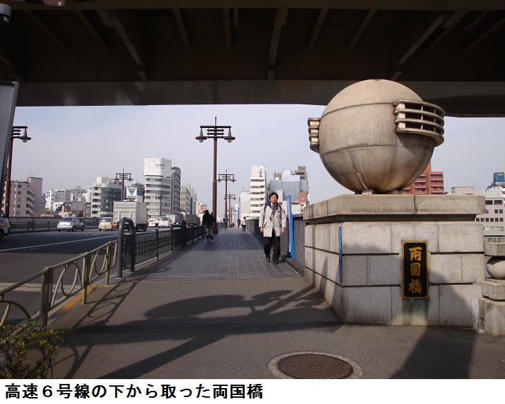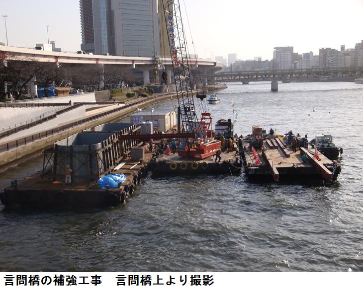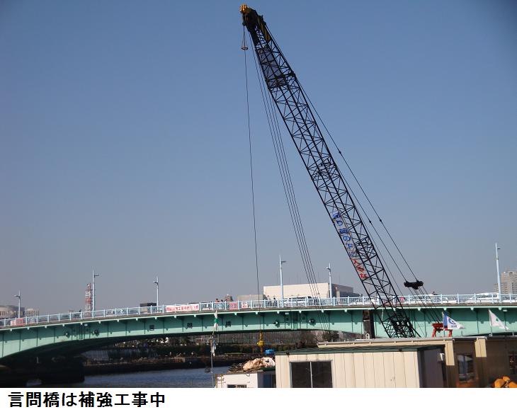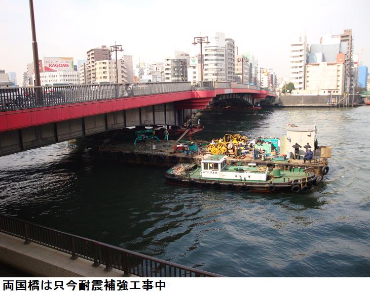 柳橋を渡って、両国橋に出る。東詰めから親水テラスに降りて、吾妻橋まで歩く。両国橋は耐震補強工事が行われ、橋桁の傍に浮き桟橋がもうけられ、工事の真っ最中。今日は隅田川を上り下りする船がひっきりなしに往来している。水上バス(観光船)だけでも5・6艘が上り下りしていた。