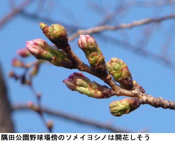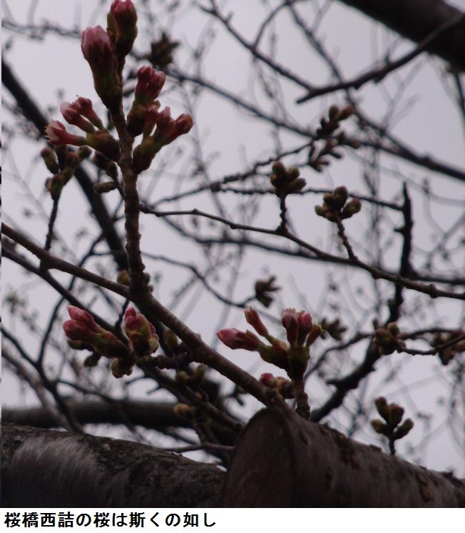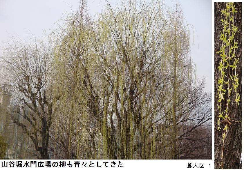 吾妻橋を渡って帰宅しようかとも思ったが気が変わり、枕橋を渡って桜橋まで遊歩道を北上した。桜の花芽はかなり膨らんで、中にはピンク色を見せているものも診られた。桜橋を渡って、山谷堀水門の広場に来ると、柳の緑がいっそう色を増したのが目に入った。辺り一面、もうすっかり春が来た。