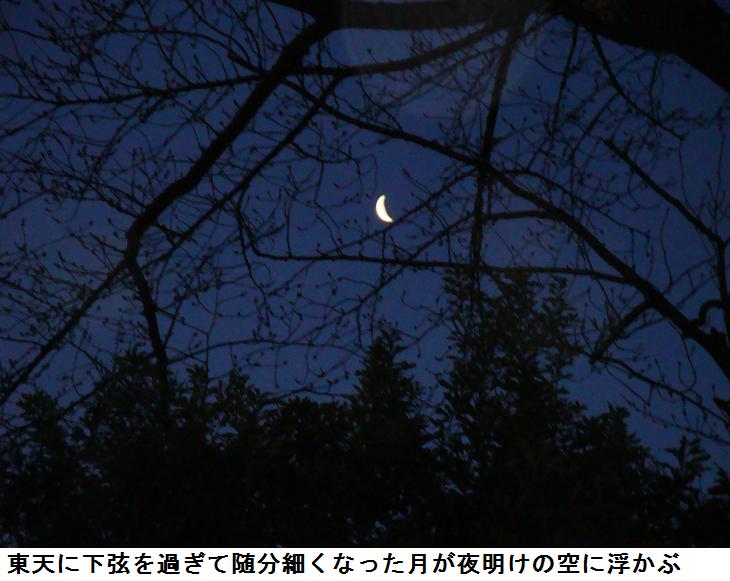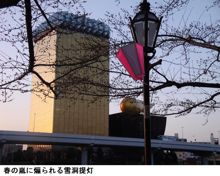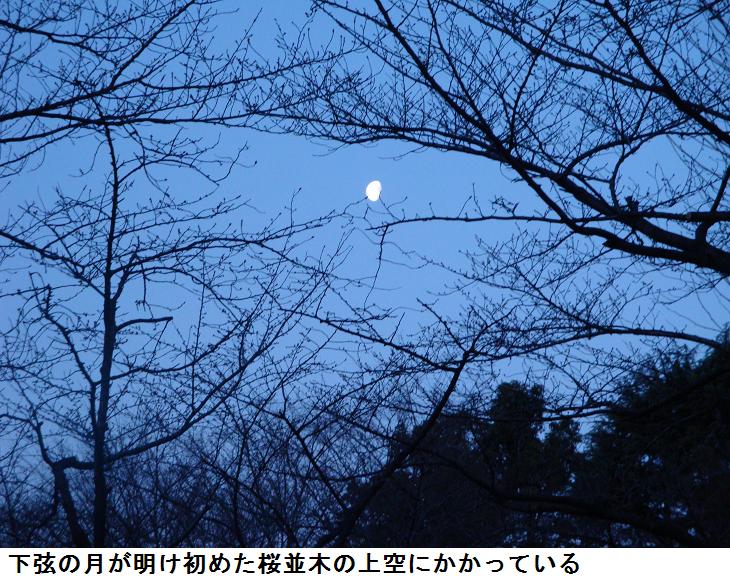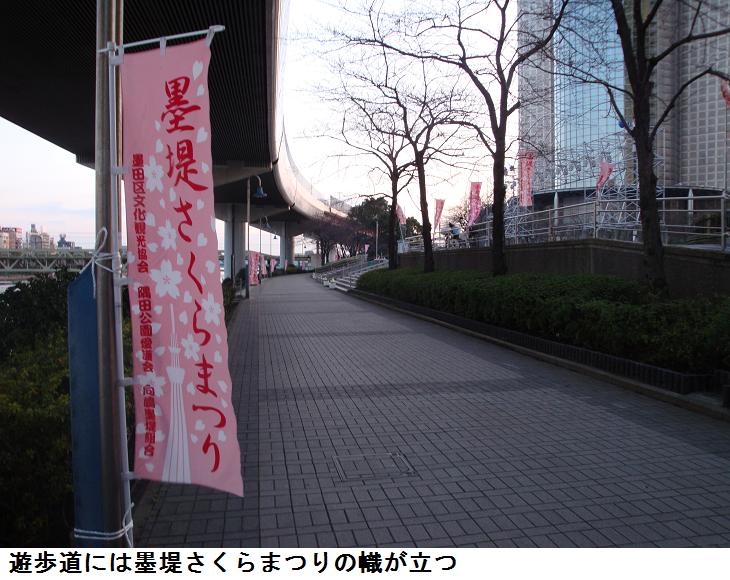 今日は旧暦の2月20日。隅田公園の桜並木の間に下弦の月がかかっている。吾妻橋の上に立つと、上流から釣り船が東京湾を目指して下ってくる。そういえば昨日の日曜日は千葉県の富津海岸では潮干狩りの人出で賑わったとか。墨田区役所裏の広場に来ると遊歩道には、気の早い「墨堤さくらまつり」の幟がずらりと立ち並んでいる。遊歩道の所々には売店兼や休み処となる葭簀張りの仮小屋が建てられている。肌に当たる川風はまだ冷たいが、周りの雰囲気はもうすっかり春である。