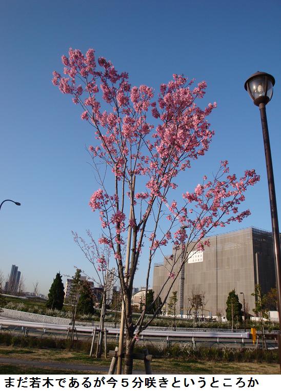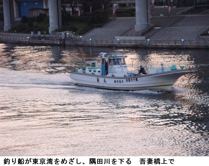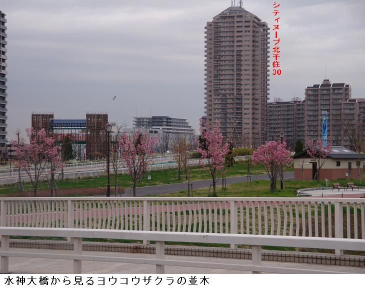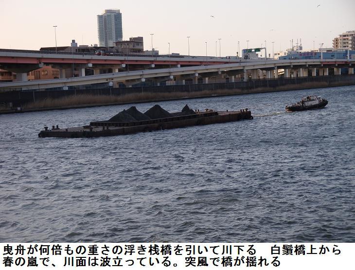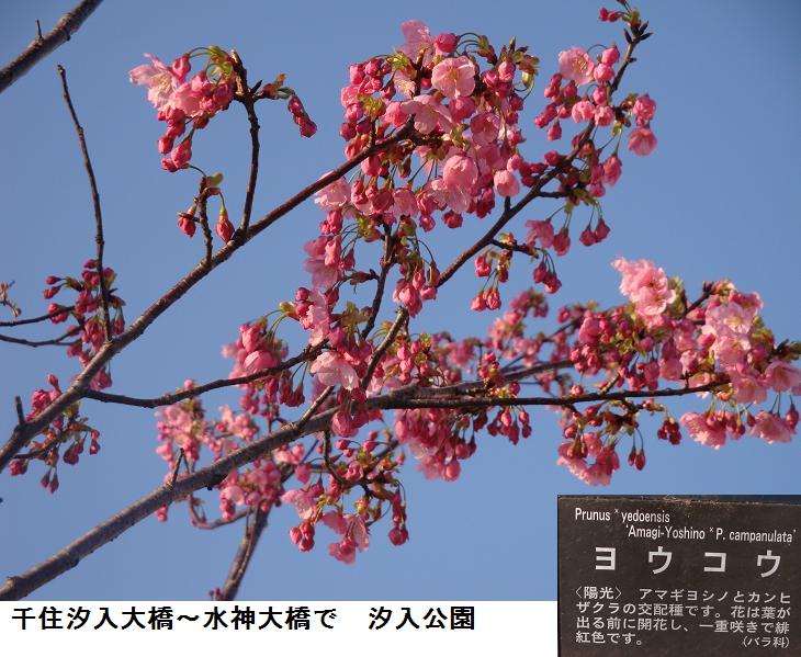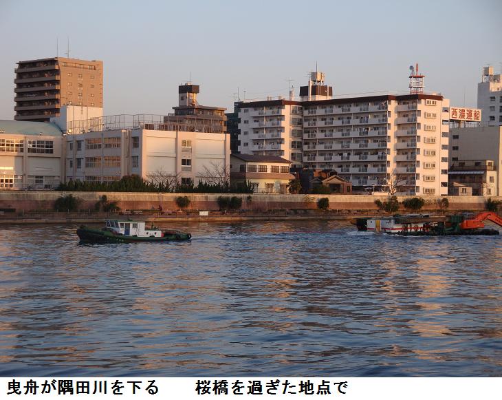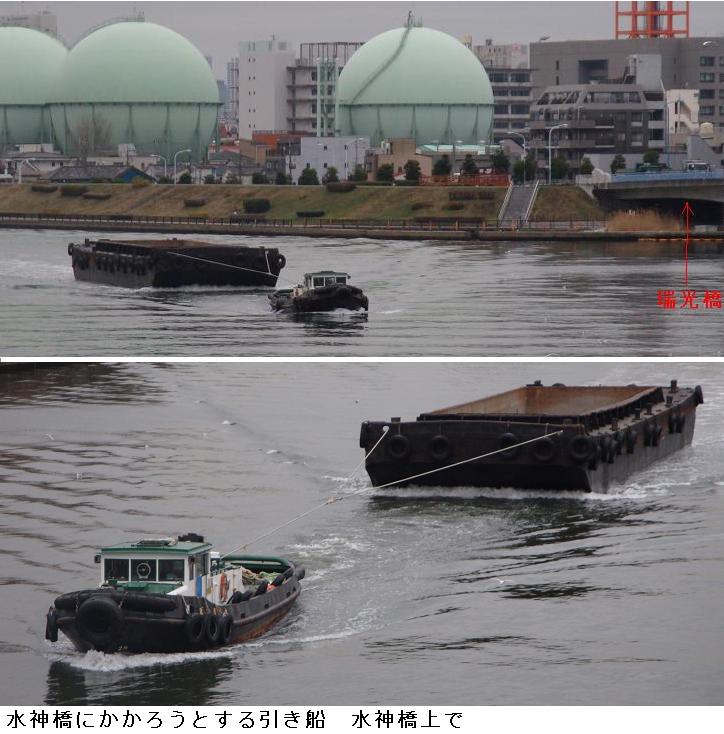 水神大橋を渡っていると今日は白鬚橋の方から引き船が上ってくるところであった。南千住のガスタンク辺りから、水神大橋の真下を潜るまで見とれていた。橋の上から北の方を望むと汐入公園のヨウコウザクラの並木が若木ながらピンクの色の花を付けているのが遠目でも見て取れた。