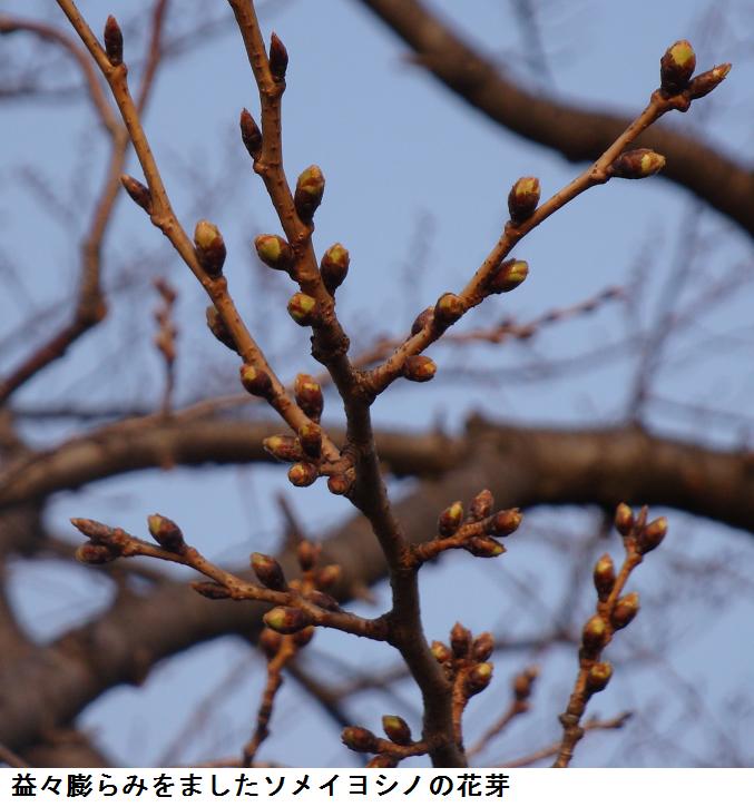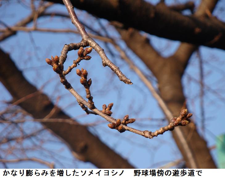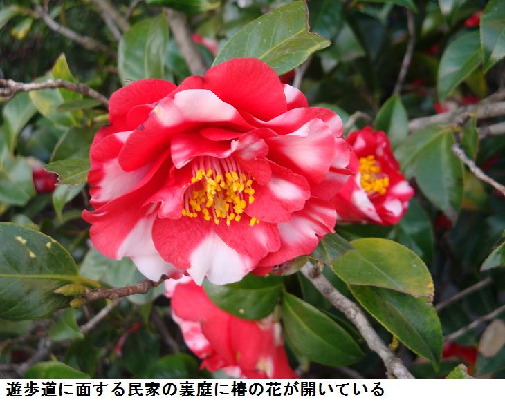 遊歩道に面するマンションや民家の裏庭には、いろいろな庭木や草花が植えられていて歩行者の目を楽しませてくれる。燃えるような赤に純白の混じった珍しい椿の花をカメラに収めた。ソメイヨシノの蕾は2日前に写した時よりもいっそう膨らんだように思えた。
