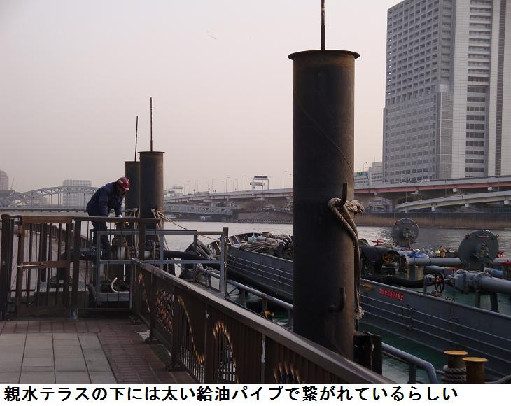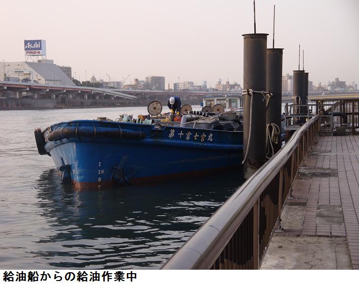 昨日の朝と同じコースを歩いたが、橋場から親水テラス降りてみた。昨日写真に撮った柳の木の下辺りに給油船が停泊しており、給油作業中であった。陸のタンクから船の給油槽への給油か、それとも船から陸のタンクへの給油かは不明。
