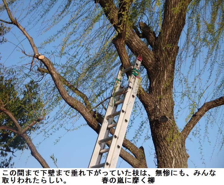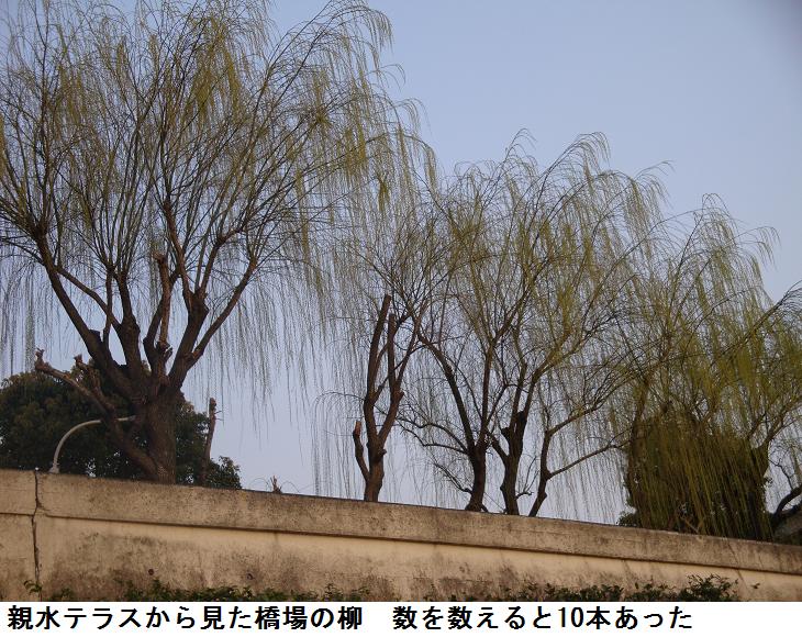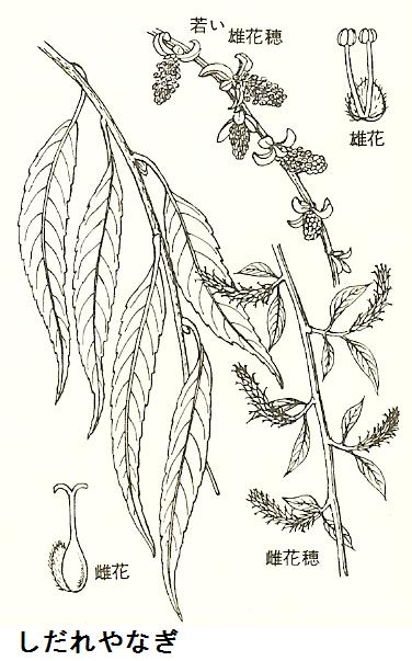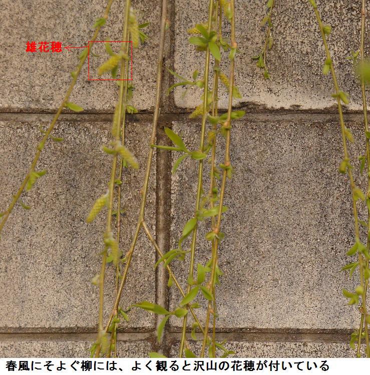 白鬚を渡り、件の柳の木の下で立ち止まり、風にそよぐ柳をよく見ると沢山の花穂を付けている。しだれ柳は早春葉が伸びきらないうちに黄緑色の花が開くという。花穂は弓状に曲がり、長さ15~30mmぐらいまで伸びる。雌雄異株である。雄花には2本の雄蕊があり、雌花には雌蕊に柄は無く柱頭は2裂するという。