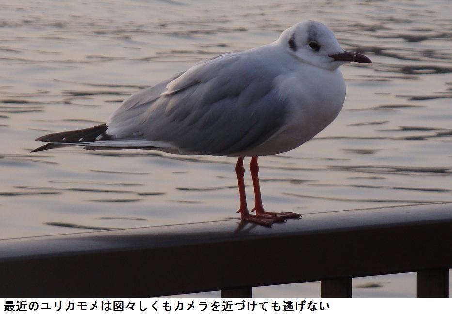 今日は、薄曇の天気であったが、下から見上げる柳もまた一興。戯れに数を数えてみると10本はある。浸水テラスの手摺欄干にユリカモメが止まっているので、カメラを向けると餌が貰えるものと勘違いしたらしく、カメラを近づけても逃げようとはしない。