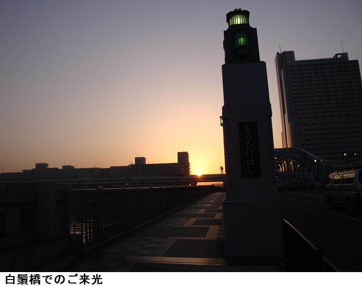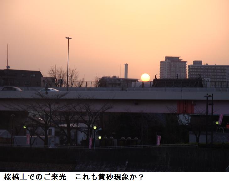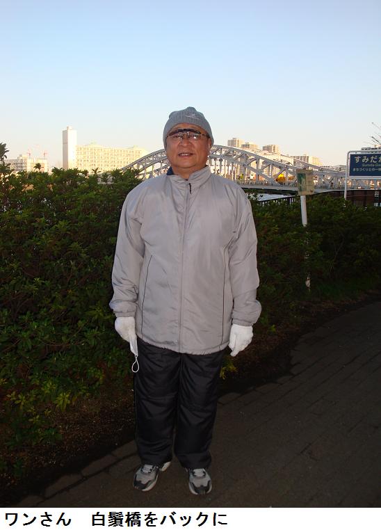今朝ほどの桜橋で見たご来光は、太陽が一際でかく真っ赤な円形に見えた。これも黄砂による影響かもしれない。中天には上弦の月が輝き、一点の雲も無いので快晴には違いないが、何となく薄靄がかかった感じである。白鬚橋にかかるあたりで、ワンさんと出会う。