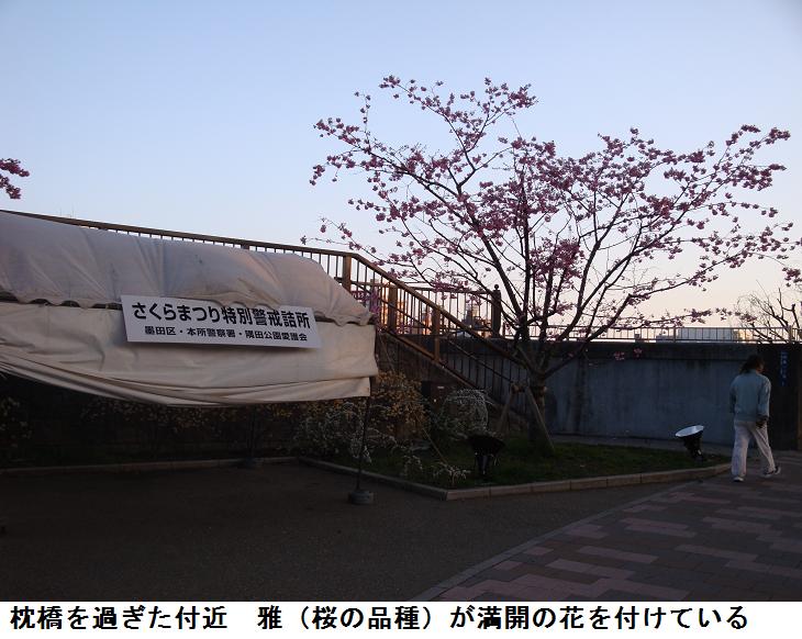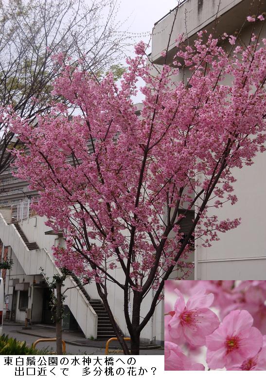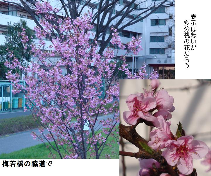 ここから、防災住宅に沿って梅若橋へと抜けてみた。梅若橋の脇の水神大橋への出口の所に3・4本の桃の木? が植えてあるが、ピンク色の花をびっしりと付けている。