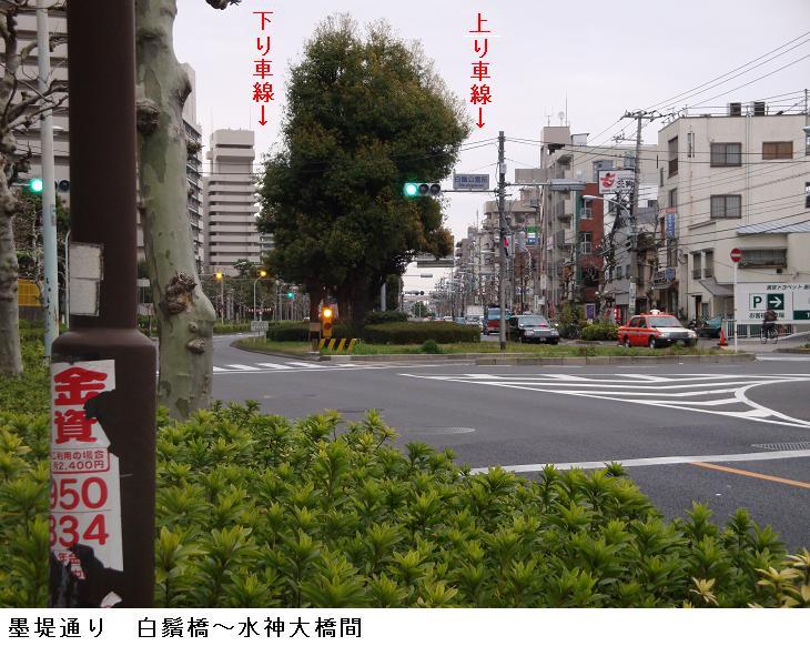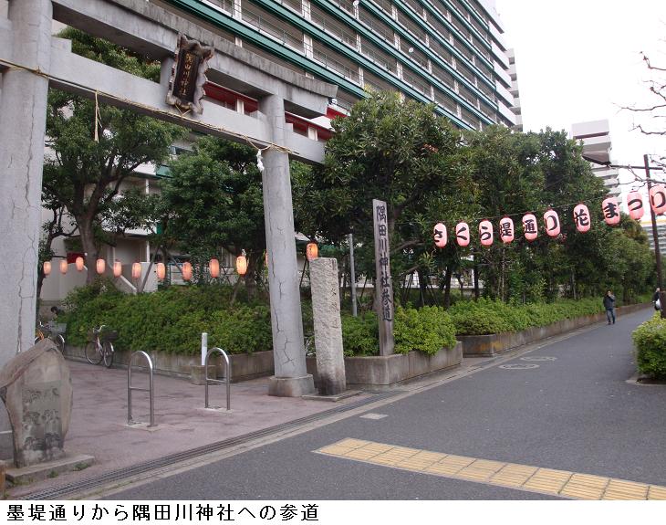 桜橋を渡ると、墨堤通りに出て、白鬚神社の前を通ると、明治通りを横切り、そのまま墨堤通りを北上してみた。明治通りから鐘ヶ淵辺りまで、墨堤通りは上り線と下り線が植木地帯で仕切られている。隅田川神社の一の鳥居は墨堤通りに面しており、防災住宅を潜って東白鬚公園に桜並木の参道が続いている。