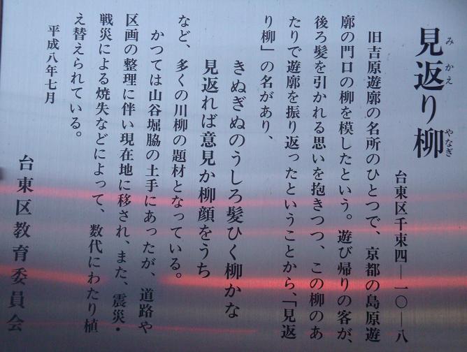 永井荷風は『里の今昔』の中でこの辺りの風情を「見返り柳の立っていてた大門外の堤に佇立んで、東の方を見渡すと、地方今戸町の低い人家の屋根を越して、田圃のかなたに小塚ケ原の女郎屋の裏手が見え、堤の直ぐ下には屠牛場や元結いの製造場などがあって、山谷堀へつづく一条の溝渠が横たわっていた。毒だみの花や、赤のままの花のさいていた岸には、猫柳のような灌木が繁っていて、髪洗橋などという腐った木の橋が幾筋もかかっていた。見返り柳を後にして堤の上を半町ばかり行くと、左手へ降りる細い道があった。これが竜泉寺町の通りで、「たけくらべ」第一回の書始めに見る叙景の文は即ちこの処であった。道の片側は鉄漿溝(おはぐろどぶ)に沿うて、郭者の住んでる汚い長屋の立ちつづいた間から、江戸町1丁目と揚屋町との非常門を望み、また女郎屋の裏木戸ごとに引き上げられた幾筋の刎橋(はねばし)が見えた。」のように記している。