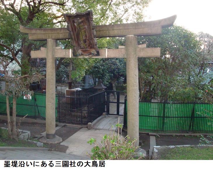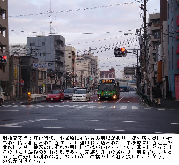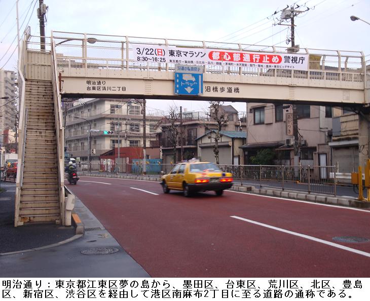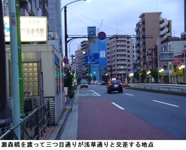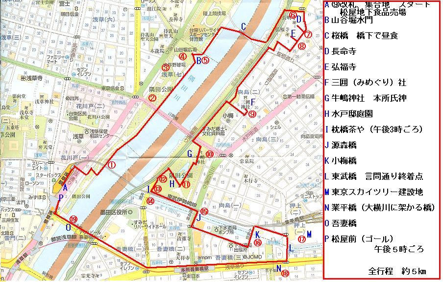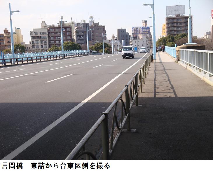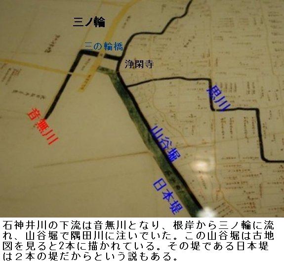 土手通りの終わる所が三ノ輪である。ここから、明治通りに沿って東進、白鬚橋西詰めから隅田川沿いの遊歩道をくだって、山谷堀の水門前広場に出る。