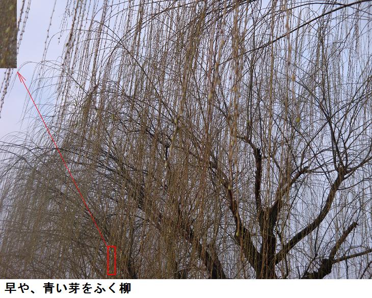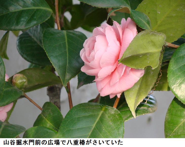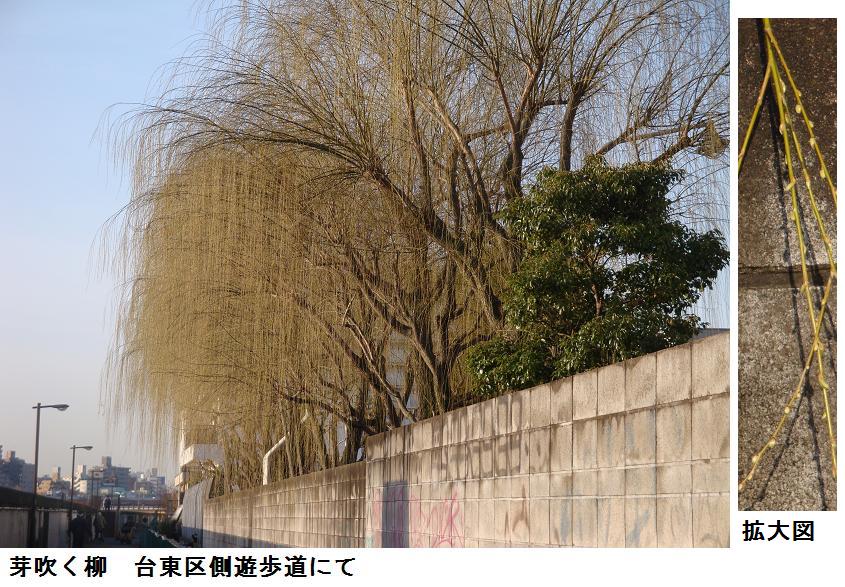 この遊歩道に沿う橋場のマンションの裏手にはさまざまな庭木や草花が植えてあり、四季それぞれによって目を楽しませてくれる。バスの駐車場に植えられている柳は良く見ると青い芽を吹いていた。桜の花芽はまだ固いが、スポーツセンター脇の白木蓮は花芽の皮を破って白い花びらをみせはじめている。山谷橋の広場に来ると八重椿が綺麗な花を咲かせていた。気温は低く、風も寒いが、もうそこら中に、春が来たような気分させてくれる。