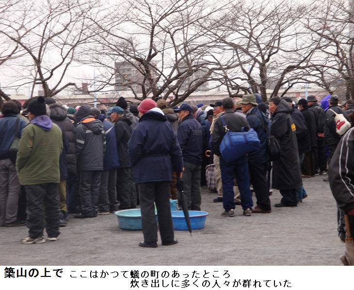 かつての蟻の町は今はまったく整備され、築山になっているが、この築山に大勢の人が屯(たむろ)しているので、のぼってみると、そこで炊き出しが行われていた。いやいや、麻生総理ですら散歩の途中でホームレスに間違えられたというのだから、この爺だって施しに預かりにこの群れに集まったと思われてもいたし方あるまい。早々に、築山を駆け下りて、帰宅した。小雨が降り出した所為か梅まつりに仮設されたテントは急ぎ片付けられている最中であった。