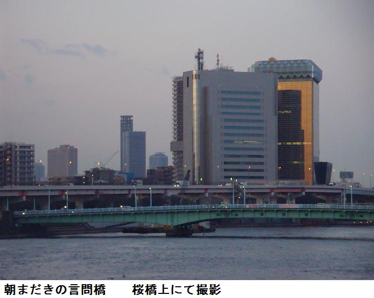 今日は久し振りの晴天だというので、まだ明け切っていない5時半に家を出て、桜橋を渡ると、墨堤通り沿いに明治通りまで北上。東白鬚公園をさらに北上、梅若橋まで来ると、何となくもっと先まで進みたくなり、梅若橋を越えて、再び墨堤通りに出ると、東の空から朝日が昇るところであった。おやおや、鐘淵紡績発祥の地に建つカネボウ物流の広告塔が、変わっている。どうやら、ここはカネボウ化粧品になつたらしい。綾瀬橋を渡り、千住曙町に出る。ここは、昨年はずっとイニシア千住曙町の建設現場であったが、ほぼ完成されたらしい。千住汐入大橋の北詰からみると、ここで隅田川が大きく彎曲しているのが良く判る。橋の上から見ると南詰の南千住のマンション群が目に入る。よくもこれだけのマンションを建設したものだと感心するばかり。