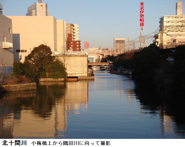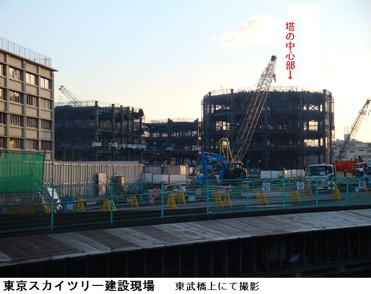 桜橋を渡り、長命寺・弘福寺をめぐり、墨堤通りに戻り、三囲社の表参道に降りて、再び墨堤通りへ出る。言問橋を潜り、牛嶋神社から水戸邸の日本庭園をまわり、枕橋茶やから北十間川沿いに川の北側を東進。源森橋を渡り、今度は川の南側を東進、小梅橋を渡り再び川の北側を東進して東武橋に出る。橋の上で東京スカイツリーの建設現場をカメラに収める。工事は急ピッチで進んでいるようで、はや20mぐらいの高さかな?