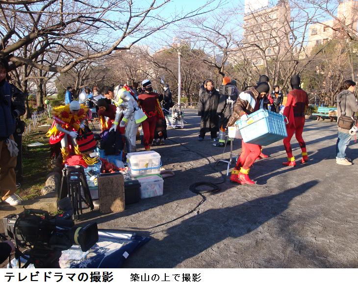 浅草通りにでると、業平橋を渡り、ここを西進、吾妻橋を渡る。昨日炊き出しが行われていた築山の上でlocation が行われていた。まだ、撮影は行われていなかったので、カメラマンに「なんの撮影ですか?」と訊ねると「テレビのドラマ撮影ですよ」という答えであった。