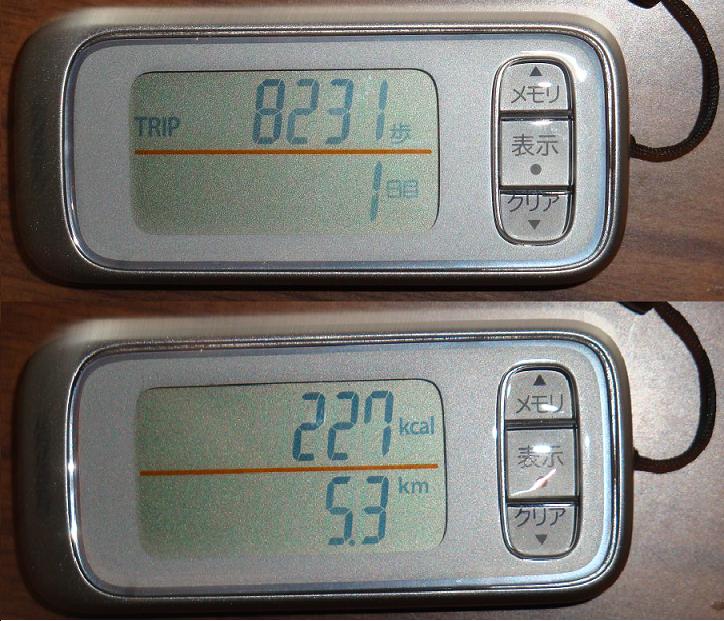 帰宅後omron万歩計の結果は8231歩、5.3km(1歩65cmに設定)と記録されていた。