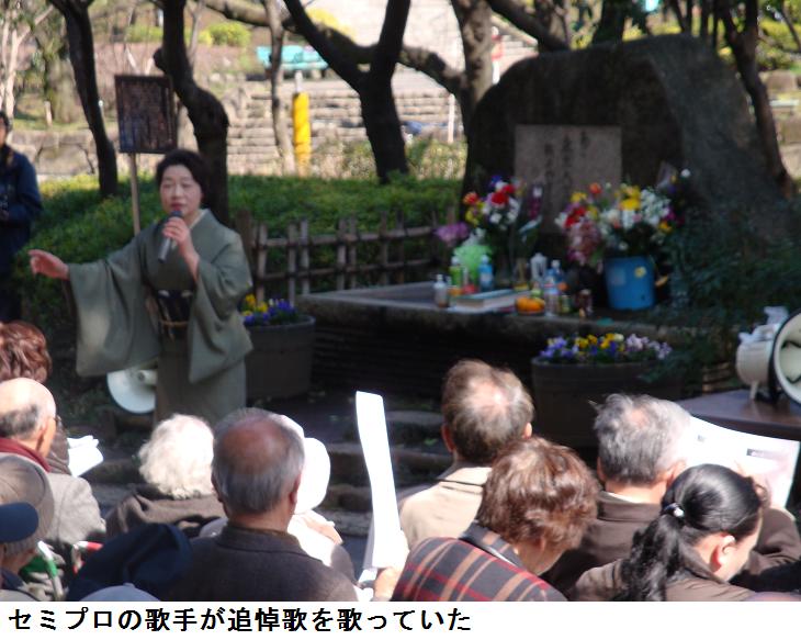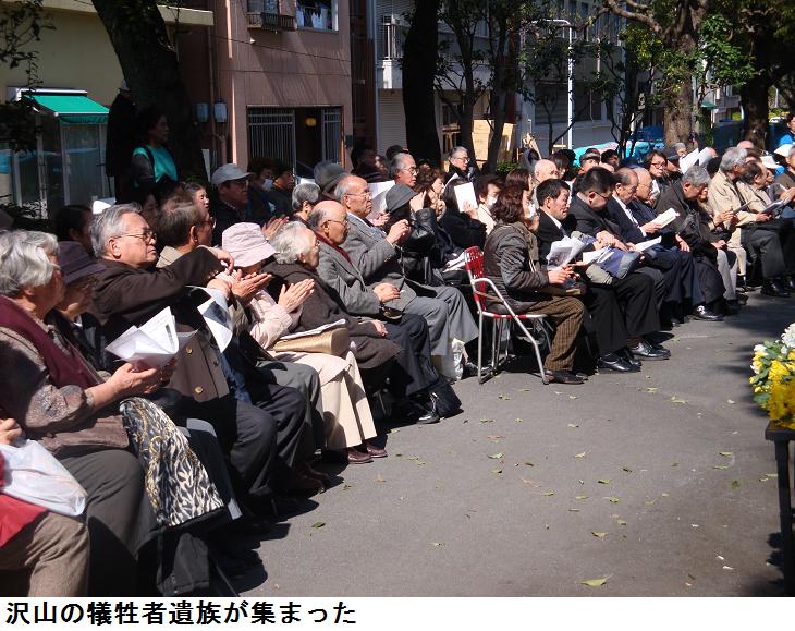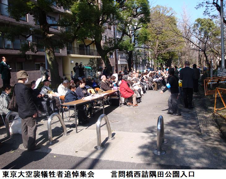 朝早くは雨模様だったので、昼飯の腹ごなしに白鬚橋の方を一周するべく徘徊に出掛けた。言問橋西詰の公園入口にある東京大空襲慰霊碑の前に来てみると、東京大空襲犠牲者追悼集会が開かれていた。慰霊碑の前は通れないので、脇道から隅田公園に入りスポーツセンターに向けて進んだ。