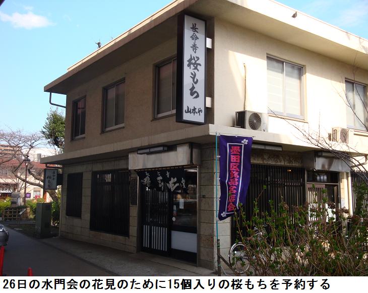 スポーツセンター脇の白木蓮は清楚な白い花を咲かせていた。日が照り始めて、風も生暖かく感じる。何時もの遊歩道を通り、白鬚橋を渡り、青色御殿の前を通って、常夜灯までくると、26日に企画している花見の回答FAXに「長命寺のさくら餅が食いたい」というのがあったのを思い出した。花見当日は店の前には長蛇の列が出来るので、とても購入することは出来ない。26日午後1時~2時に来店するからと15個入りの折を予約しておいた。