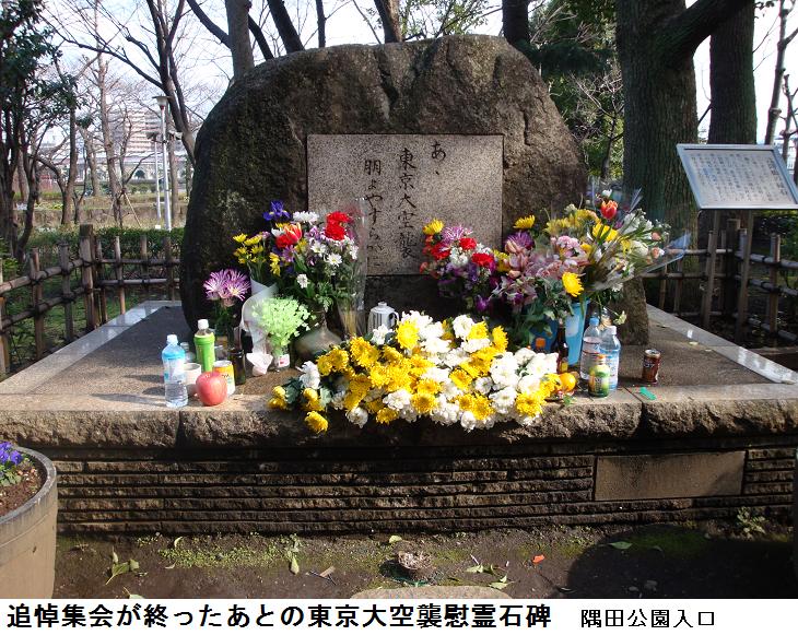 言問橋を東詰から渡り、再び西詰の隅田公園入口に来ると東京大空襲犠牲者追悼集会は終わっていて、慰霊碑の前には沢山の花や飲み物が供えられていた。公園内を通って帰宅した。