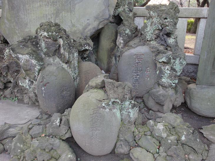 江戸時代、腕力や体力を鍛えた者が、重い石を持ち上げて力競べなどを行ったという。この時に用いた石を力石と呼び、江戸や大坂では力自慢たちにより、‘力持番付’が付けられるほど、盛んに行われたそうじゃ。その発祥は、本所・深川であったと考えられているらしい。また農村では、おとなに仲間入りするための通過儀礼のひとつとされていたという。力石を使った力競べは、明治時代以降は廃れていったが、牛嶋神社の境内には9個の力石が集められているる力石には、重さや年号が刻まれるばかりではなく、強さの代名詞として刻むことも多くあり、「麒麟」石や「雲龍石」もこうしたうちの一つなのじゃ。 中には、石を持ち上げた力持ちの名を刻む場合もある。「内田店平蔵」とは、寛政6年(1794年)から活躍していた‘石の平蔵’のことで、各地にその名を残した職業的力持ち力士だったようである。「馬石」は、馬の顔のように長い石で90cmもあり、「さし石」は、この石を差し上げたことから刻まれたようじゃ。 コンクリートで固定されているために、重量については不詳でわるが、刻まれた数値を信ずるならば、45貫目から55貫目(約169キログラムから206キログラム)もあることになるようじゃ。