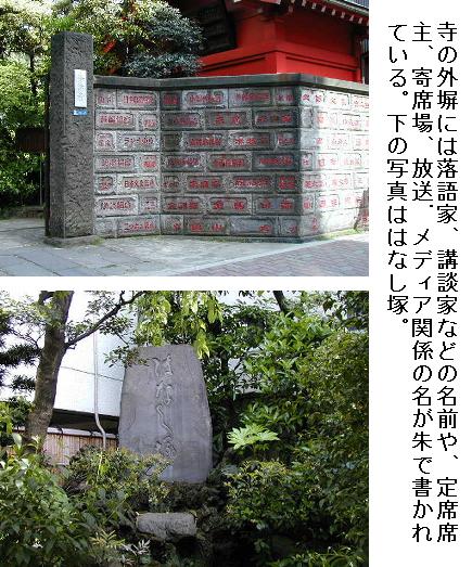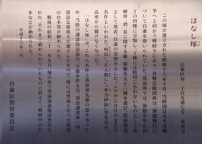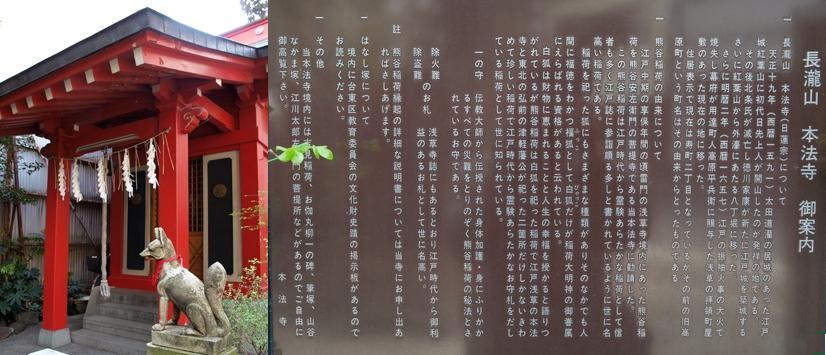 長瀧山 本法寺は、天正十九年(1591)太田道灌の居城のあった江戸城紅葉山に初代日先上人が開山したのが創建であるという。その後、北条氏が滅亡し徳川家康が新たに江戸城を築城した際に紅葉山から外壕にあたる八丁堀に移った。さらに明暦3(1657年)江戸の振袖火事の大火で焼失し、幕府が茶碗用達人、高原平兵衛に賜与した浅草の拝領町屋敷のあった現在の地に移った。住居表示で現在は寿二丁目となっているが、その前の旧高原町という町名はその由来からとったものであるという。江戸中期の享保年間の頃、雷門の浅草寺境内にあった熊谷稲荷を熊谷安左衛門の菩提寺である本法寺に勧請した。この熊谷稲荷は江戸時代から霊験あらたかな稲荷社として信者も多く、江戸誌にも参詣頗(すこぶ)る多しと書かれているように名高い稲荷である。稲荷を祀った狐にも様々な種類があるが、なかでも福徳を授ける福狐(ふっこ)として白狐(びゃっこ)だけが稲荷大明神に選ばれる資格があるといわれている。熊谷稲荷は白狐を祀った稲荷でここ本法寺と弘前津軽藩公が祀った二個所しかない、極めて珍しい稲荷であるという。境内にははなし塚もあった。