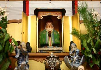 韓湘子:韓湘子は韓湘の尊称で、唐代の人といわれる。有名な韓文公(韓愈、768~824年)の姪(おい)あるいは姪孫(てつそん)であるといわれている。笛を吹いている。韓愈が潮州に左遷される旅の途中、大雪にあい、そこに韓湘子が現れ藍関の駅舎に泊まった。別れ際に韓愈の将来を予言したが、それがすべてあたったというということじゃ。