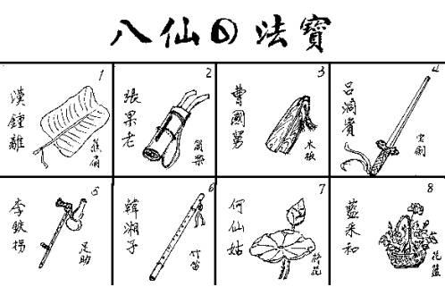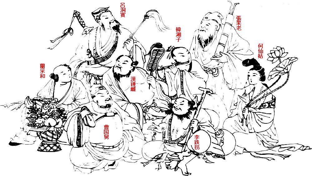 何仙姑:名は瓊(けい)、唐代の人で、グループ中たった1人の女性。手に蓮の花や葉をもつ。広州の雲母渓に住んでいて、14・5歳のときに雲母の粉末を食べ仙人になり、空中を飛ぶように歩き、毎日山中深く入って柔らかい筍を探し病気の母に食べさせたので、人々の尊敬を受けたという。