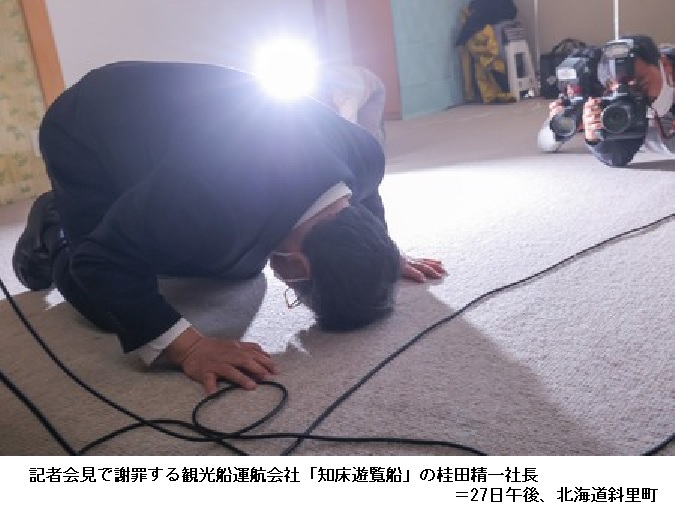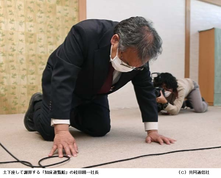 「私の至らなさ」繰り返す 土下座3回、事故を謝罪―観光船社長、初の会見 ―― 「判断は間違っていた」。観光船「KAZU I(カズワン)」が北海道・知床半島沖で消息を絶って以降、27日に初めて記者会見を開いた運航会社の桂田精一社長(58)。事故当日の出港判断に誤りがあったと認めた上で、「私の至らなさだ」と繰り返し、計3回土下座して謝罪した。