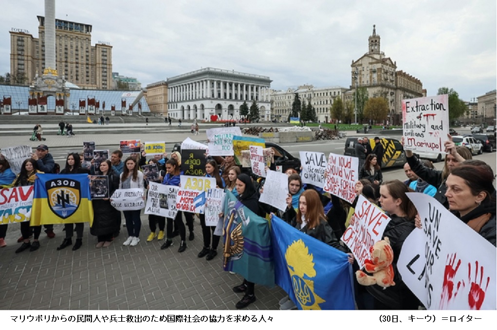 ラブロフ氏は停戦交渉を巡り「協議の議題には(ウクライナの)非ナチ化、地政学上の新たな現実の承認、制裁の解除、ロシア語の地位などが含まれる」と主張した。「容易ではないが、交渉継続に賛成だ」と述べたものの、制裁解除など一連の難題を突きつけることで停戦協議に後ろ向きな姿勢を改めて示した。 【日本經濟新聞 2022年4月30日 23:58】