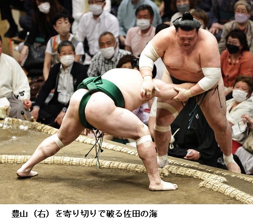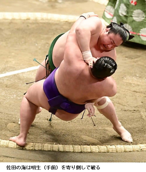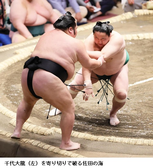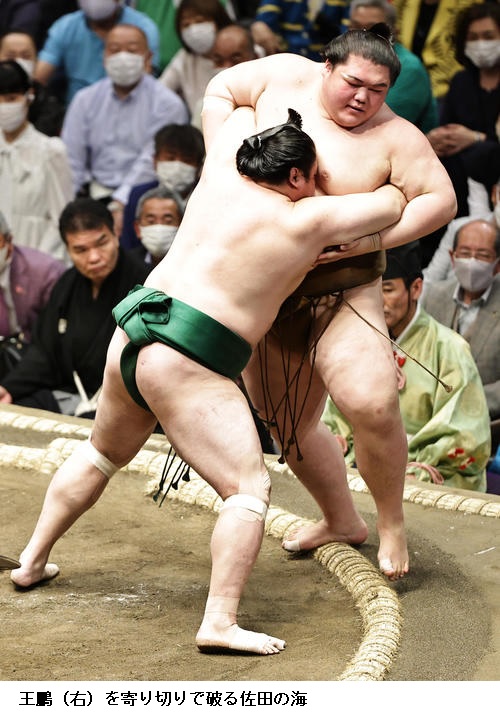 ▽佐田の海に王鵬は佐田の海が寄り切り。