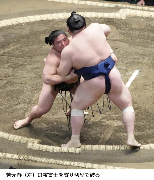 ☆若元春 変化があるかもしれないなって思ったんで、ちょっと遅れ気味に立っった。先場所くらった肩透かし、たぐられる感じが出たときは、内心焦りました。調子は良いと思います。あとは実力が足りるかどうか。(好調の要因は)稽古相手が充実しているので、同じ幕内に荒篤山関と弟(若隆景)がいるんで。前に攻める相撲を意識しながら、まだまだ1日、1日次のことを考えていきたい。