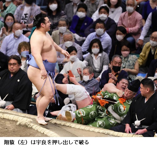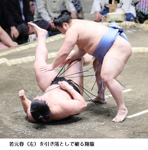 ☆翔猿 下から、下からと、どんどん攻められたのは良かったです。(初日から無傷の4連勝だが)体の調子が良いです。1日、1日集中して頑張ります。