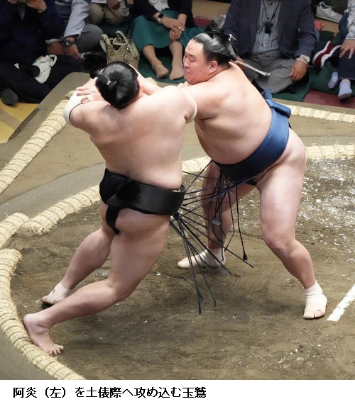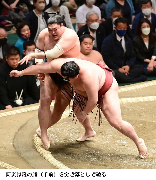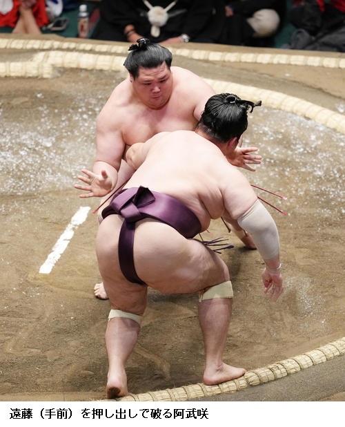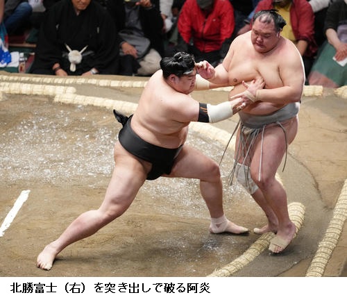 ☆阿炎 (対戦した遠藤は)すごく突きにくかったというか、突けなかった。距離を保つのに必死に手を伸ばしてたんですけど、うまい具合に突けなかった。稽古でも流れからの四つをやっていたんで、それが出て良かった。昔だったらすぐに投げていたけど、寄るということができたのは稽古をしてきたからかな。まだまだ自信を持ってではないけど、集中できている証拠かな。これを糧に明日からも一番、一番集中してやりたい。