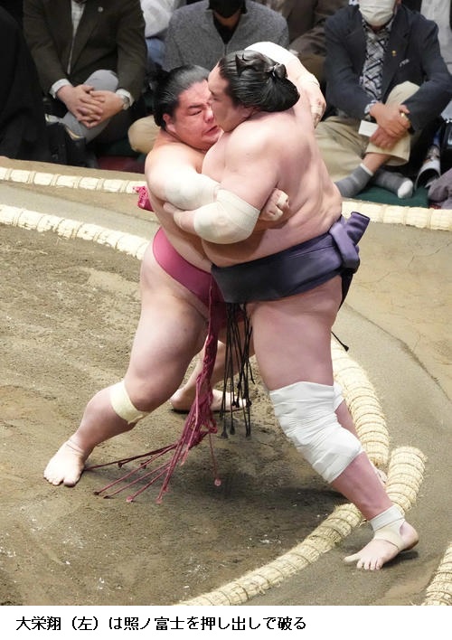 ☆大栄翔 立ち合いもしっかり踏み込めた。流れが良かった。集中してやりたいと思います。立ち合いしっかり当たれているのが良いのかな。(好調の要因は)しっかり踏み込み当たれているのが良いのかなと思います。稽古場でも立ち合いからしっかりぶつかることを意識してきましたし、ぶつかり稽古でもしっかり当たることをしてきました。しっかり集中して、勝ち星につなげたい。