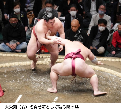 ☆隆の勝 起こされたんで、次にはたきくるかなと思って、落ち着いていけたのがよかった。右まわし取れていたので逆転ができた。(最後は)たまたまというか流れ。狙ったわけじゃないです。
