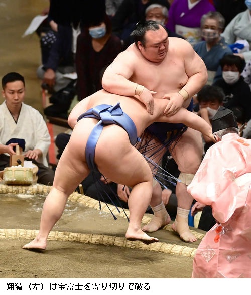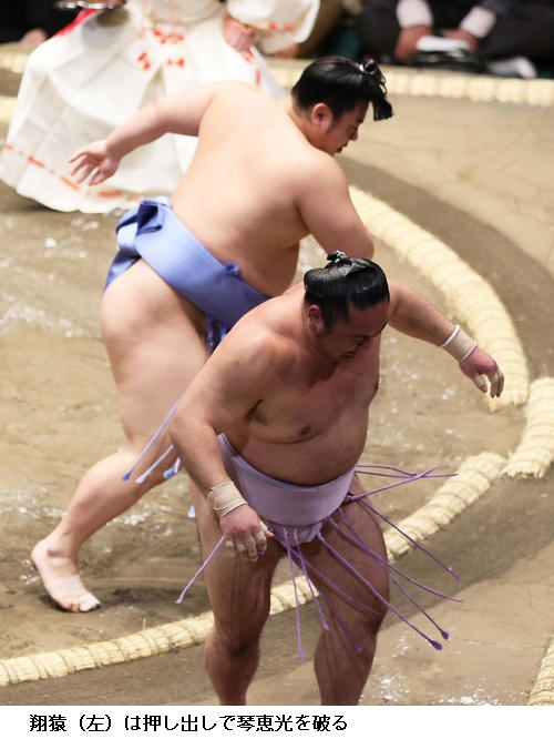 ▽翔猿に琴恵光は翔猿が押し出しで勝って4連勝です。