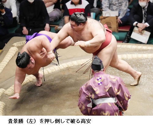 ☆貴景勝 今日の相撲は今日だけなので、一生懸命やりました。(しぶとい相手に突き落としで白星に)流れの中で出たので、また明日から集中してやりますよ。明日の相撲があるので、また頑張ります。