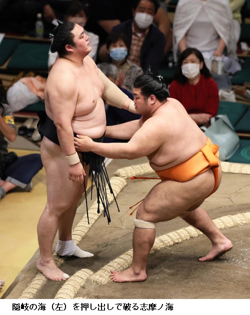 ▽隠岐の海に志摩ノ海は志摩ノ海が押し出しで初白星です。